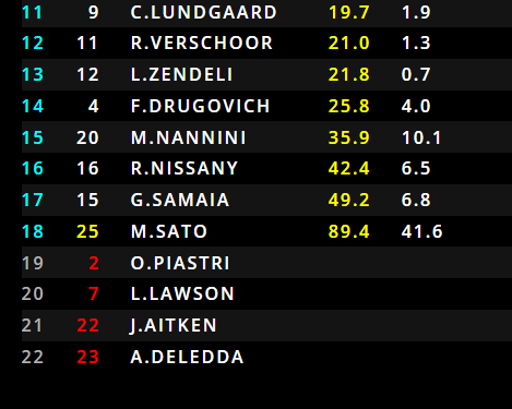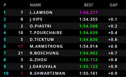 Juri Vips, die dus vanaf de tweede plek start. Allebei de Red Bull-jongelingen kwamen uitstekend uit de verf op het nauwe straatcircuit, waar de auto's van Hitech het prima lijken te doen. Oscar Piastri heeft zijn Prema op de derde startplek weten te zetten.