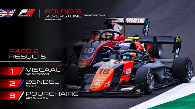 De twee jongelingen voerden de gehele race het veld aan met Zendeli als leider en Viscaal continu binnen een seconde van hem. Pas in de laatste ronde zette de Nederlander de aanval op het rechte stuk voor Copse. Hij passeerde hem, maar Zendeli pakte zijn positie weer terug in Stowe. Viscaal gaf niet op en ging buitenom in de laatste bocht alsnog de leider voorbij om zodoende zijn eerste Formule 3-overwinning te pakken.