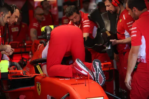 Een opmerkelijk gezicht in de pitbox van Ferrari. Een engineer van Vettels auto moest voor een reparatie in de cockpit van de Duitser duiken, met als gevolg hilarische foto's...