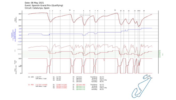 Bij het uitkomen van bocht 10 mist Perez enorm veel tijd, wat hem in de derde sector (waar bocht 10 ligt, red.) uiteindelijk een halve seconde kost op Verstappen. Ook in de eerste en tweede sector mist de nieuwe coureur van Red Bull één en tweede tienden van een seconde respectievelijk. Tussen de twee coureurs kan dus ook de conclusie getrokken worden dat Perez voorzichtiger wilde zijn na zijn eerdere spin in Q3, gewoonweg om erger te voorkomen. Uiteindelijk kan hij hierdoor niet aansluiten en zal Perez de Grand Prix van Spanje moeten starten vanaf de achtste positie, iets wat Red Bull waarschijnlijk anders had willen zien.