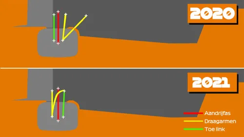 In 2020 zaten de draagarmen bij Red Bull aan de onderkant vóór de aandrijfas. Achter de aandrijfas zat de toe link. Voor dit jaar draaien ze deze hele samenstelling om, waarmee ze de filosofie van Mercedes volgen. Vanaf nu zit de toe link vooraan en de draagarmen juist achter de aandrijfas. De draagarmen aan de bovenkant van de ophanging blijven nagenoeg hetzelfde als vorig jaar. Hieronder een visualisatie van de veranderingen.