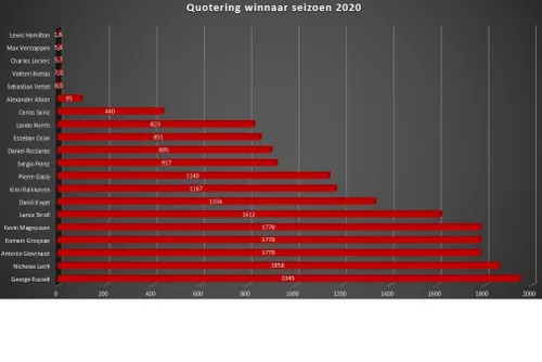 Voorafgaand aan elk Formule 1-seizoen kiezen de bookmakers de quoteringen voor het nieuwe jaar. Hoe groter de kans op de titel, hoe lager je winst. F1Maximaal is op onderzoek uitgegaan en heeft op basis van tien populaire goksites de gemiddelde quotering uitgerekend per coureur. In 2020 zullen er twintig coureurs deelnemen, van deze coureurs wordt unaniem gedacht dat Lewis Hamilton de grootste kanshebber is op het wereldkampioenschap in 2020. In de top drie bevinden zich ook de twee toptalenten Max Verstappen en Charles Leclerc. Voor de lezers die zelden tot nooit een gokje wagen, een quotering geeft weer wat je uitbetaling zou zijn, mocht je een euro inzetten. Hoe lager de quotering van een gebeurtenis is, hoe hoger de bookmakers de kans achten dat dit evenement ook daadwerkelijk plaats zal vinden. Om het voorbeeld toe te lichten kunnen we kijken naar de coureur met de hoogste quotering en de coureur met de laagste quotering.