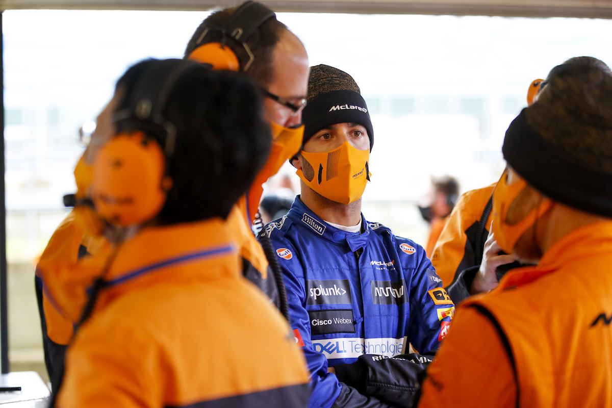 Daniel Ricciardo reageerden voor de camera nadat zij hun eerste rondjes in de nieuwe MCL35M hadden gereden.