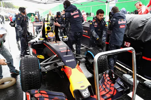 De Red Bull-bolide van Max Verstappen tijdens één van de rode vlag-momenten (Foto: Getty Images/Red Bull Content Pool)