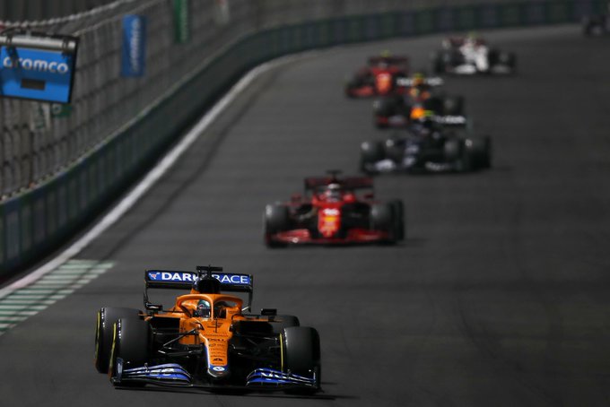 Ricciardo, die op de harde band begon, kende een goede start op zondag en verschalkte meteen Yuki Tsunoda en Antonio Giovinazzi om naar plek negen te klimmen. Aan het begin van de tweede ronde probeerde de 32-jarige Australiër Pierre Gasly in te halen in bocht 1, maar een poging aan de buitenkant mislukte. Naarmate de openingsfase vorderde, bleek de Fransman te snel voor de McLaren-man. Het gat bouwde op tot over een seconde, terwijl Alonso op P10 juist binnen het DRS-venster van Ricciardo kon blijven.