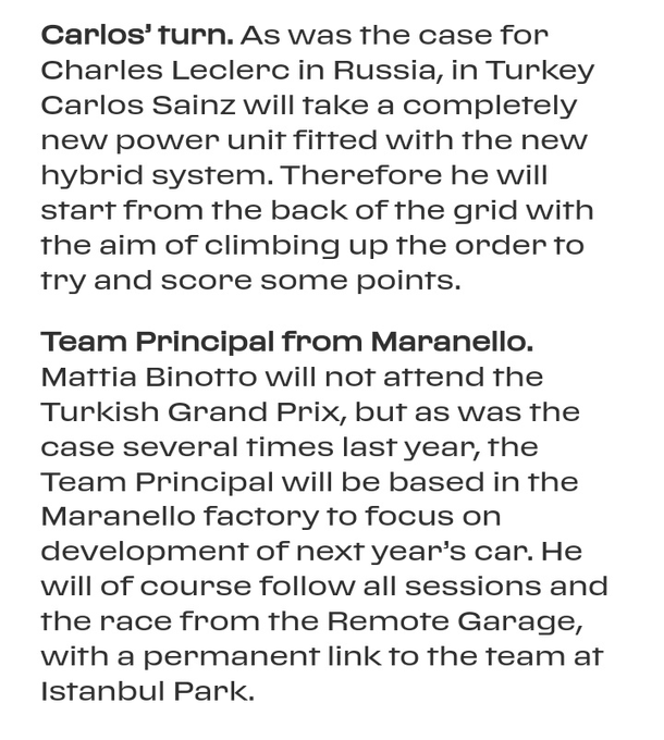 Carlos Sainz krijgt een nieuwe Ferrari-motor voor de Grand Prix van Turkije en moet hierdoor de race van zondag achteraan starten. In Rusland kreeg teamgenoot Charles Leclerc al een nieuwe motor en nu is het de beurt aan de Spanjaard. 'Zoals het geval was met Leclerc in Rusland, is het nu Sainz die een nieuwe motor krijgt. Hierdoor zal hij achteraan de grid moeten starten en hopelijk plekken winnen om punten te pakken', zo luidt het officiële statement van Ferrari. De nieuwe krachtbron heeft enkele updates aan de hybride systemen en infrastructuur, waardoor het team een aantal paardenkrachten wint.
