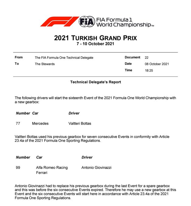 Antonio Giovinazzi en Valtteri Bottas hebben een versnellingsbakwissel doorgevoerd bij hun respectievelijke teams. Omdat ze nog binnen de marge zitten van de toegestane hoeveelheid van het onderdeel, volgt er geen gridstraf voor de wissel.