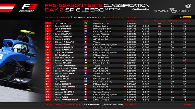Formule 3-testdagen. De Braziliaan reed op de Red Bull Ring een 1:18.592, een goede tiende van een seconde sneller dan Dennis Hauger, die op P2 eindigde. De Nederlandse