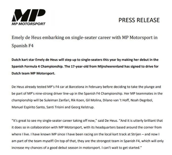 De Nederlandse Emely de Heus zal dit jaar uitkomen voor MP Motorsport in het Spaanse Formule 4-kampioenschap. De 17-jarige reed vorig jaar nog in de karts en zal dit jaar haar debuut maken in de autosport. De Heus had het volgende te zeggen: 'Het is geweldig dat mijn single-seatercarrière nu echt gaat beginnen en ook nog eens met MP Motorsport, dat dicht in de buurt is van mijn woonplaats. MP is het sterkste team in het kampioenschap, wat alleen maar mijn kansen zal verbeteren. Ik kan niet wachten om te beginnen.'