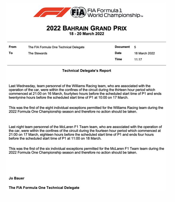 McLaren en Williams hebben op Bahrain International Circuit de avondklok genegeerd om te werken aan het Formule 1-materiaal van 2022. Williams deed dit op woensdag, McLaren op donderdag. Williams mag nog zeven keer aan het materiaal werken buiten de toegestane uren om in 2022, terwijl dat er voor McLaren nog vijf zijn.