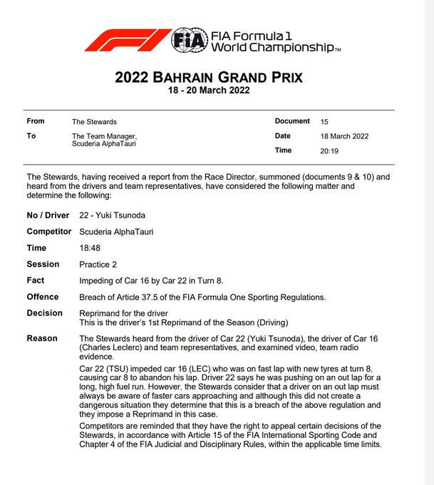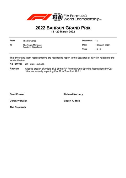 Yuki Tsunoda moet om 17.45u Nederlandse tijd langs bij de stewards. Tijdens de tweede vrije training blokkeerde de AlphaTauri-rijder Charles Leclerc en dat zorgt ervoor dat hij een bezoek moet brengen aan de wedstrijdleiders. Het is de vraag of de coureur ook een straf gaat krijgen voor de race of dat hij slechts een vermaning krijgt. Het incident gebeurde immers in een vrije training en niet tijdens de kwalificatie.