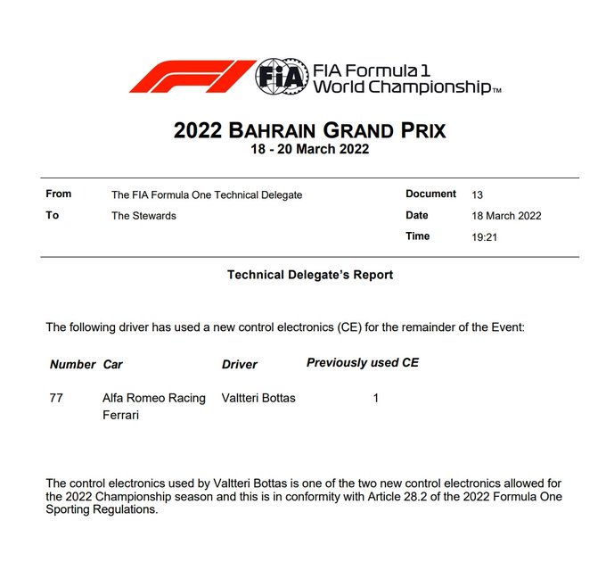 Valtteri Bottas te vervangen. De Ferrari-motor van de Fin heeft dus na de eerste twee sessies van het jaar al een nieuw onderdeel nodig, wat vrij vroeg is. Voor de rest van het jaar mag hij nog twee keer zo'n nieuw onderdeel installeren.