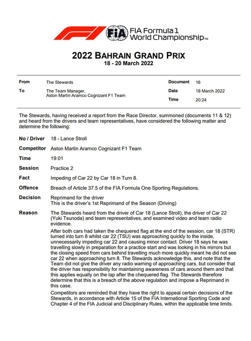 Yuki Tsunoda en Lance Stroll moesten zich melden bij de stewards na twee incidenten in de tweede vrije training. Tsunoda blokkeerde Charles Leclerc die in een snelle ronde zat, terwijl Stroll de vleugel van de Japanner kapot reed aan het einde van de tweede vrije training. Voor beide coureurs loopt het met een sisser af. Ze komen er vanaf met een reprimande.
