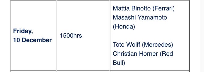 Christian Horner en Toto Wolff moeten zich voor de laatste race van dit seizoen samen melden tijdens de persconferentie op vrijdag. Beide teambazen staan erom bekend wel eens verbaal uit te halen naar elkaar. Met een spannende titelstrijd, die komend weekend beslist wordt, zal dat niet anders worden. Eerder werd ook al duidelijk dat Max Verstappen en Lewis Hamilton gezamenlijk worden ondervraagd door de pers op donderdag.