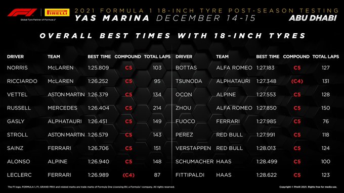 De testdagen voor de nieuwe Pirelli-banden zitten erop. In twee dagen konden de teams data vergaren om de band, die volgend jaar geïntroduceerd wordt, zo goed mogelijk te leren gebruiken. De snelste tijd van de testdagen werd gezet door Lando Norris in zijn