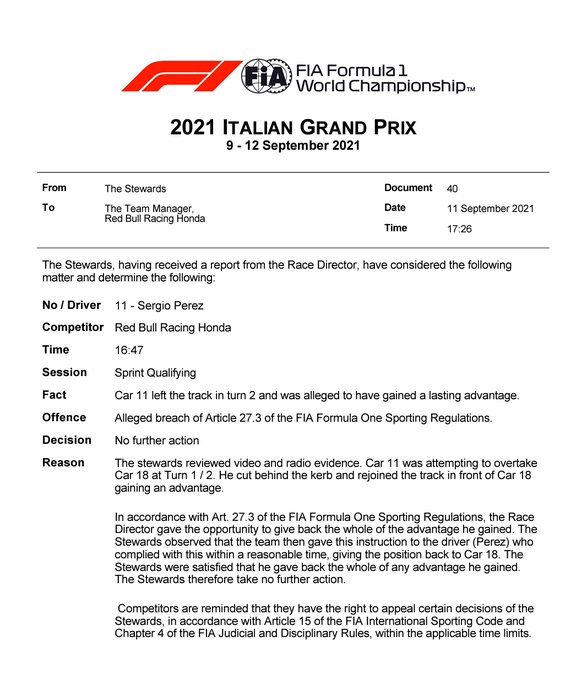Aston Martin en Alpine worden met een boete van 5000 bestraft voor het pitlane-incident in Q2. Het Britse team stuurde Sebastian Vettel op onveilige manier naar buiten, waardoor de Duitser bijna tegen Lewis Hamilton aanreed. Deze moest uitwijken om een ongeluk te voorkomen. Vettel raakte bij het uitrijden van de pitbox ook bijna een Alpine-monteur, die op dat moment Esteban Ocon naar buiten wilde loodsen. De stewards hebben besloten dat dit de schuld van de monteur was, die op een onveilige plek stond. In het officiële strafdocument staat dat andere monteurs even ver de pitstraat in stonden; echter, alleen de Alpine-monteur creëerde hiermee een onveilige situatie, dus alleen hij wordt bestraft.