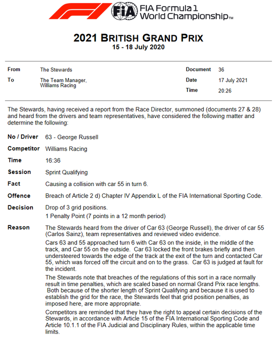 Carlos Sainz in ronde 1 van de sprintrace op Silverstone. De Williams-coureur kwam in aanraking met de Ferrari die aan de buitenkant van Brooklands voorbij wilde gaan. Het zorgde ervoor dat Sainz in de rondte ging en zo een inhaalrace moest rijden. Door de straf begint Russell vanaf een twaalfde plaats tijdens de Grand Prix van Groot-Brittannië.
