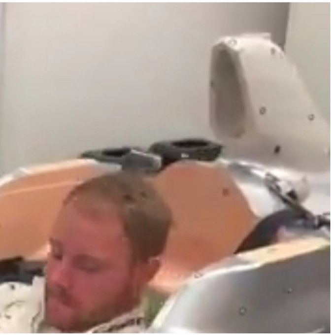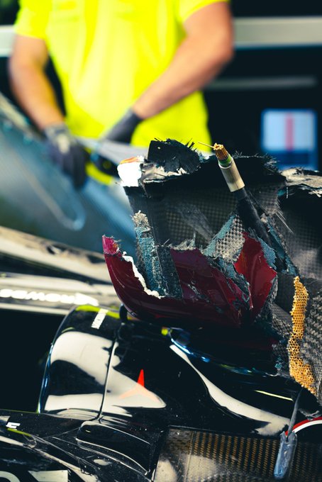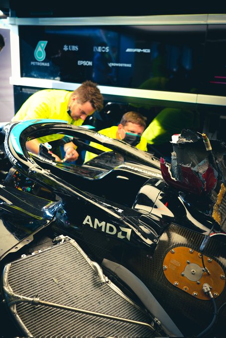 De roll hoop bij de bolide van Hamilton, het sterke skelet is zo goed als intact gebleven (Foto: Mercedes AMG F1 / Twitter @ScarbsTech