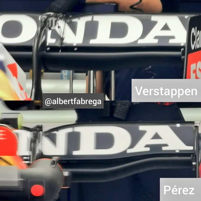 Links zijn twee foto's te zien van de Red Bull-achtervleugels. Boven (Max Verstappen) verschilt significant van onderen (Sergio Pérez). Met name de ronding aan de onderkant van het onderdeel is zeer duidelijk te zien. Aan de binnenkant van de vleugel, tussen de buik van de D en de linkerpoot van de A in het Honda-logo, loopt bij het ontwerp van Pérez de vleugel iets af. In combinatie met de dikkere onderkant genereert dit meer downforce dan bij de bovenste afstelling. Daar loopt de vleugel volledig horizontaal, wat op het rechte stuk minder weerstand genereert, maar ook tijd kost in de bochten.