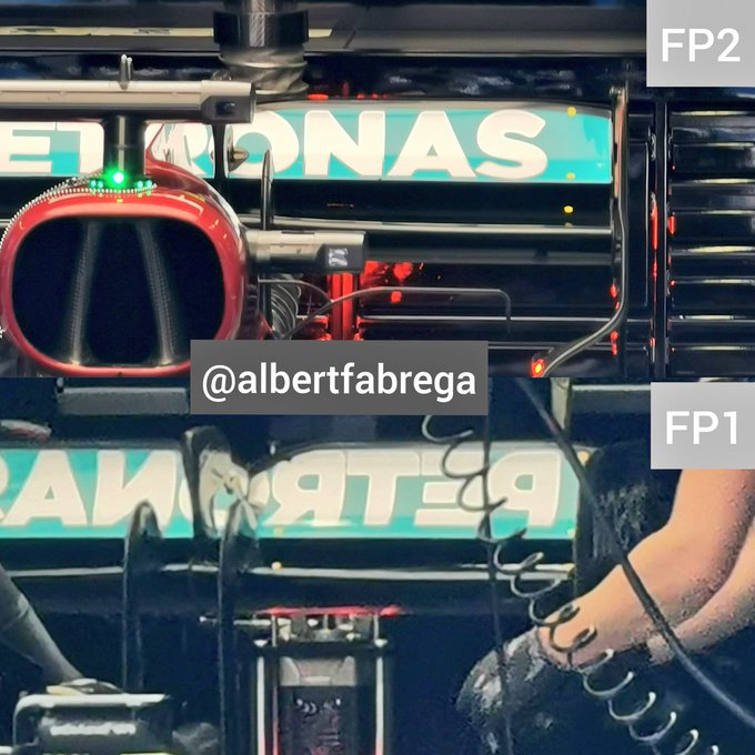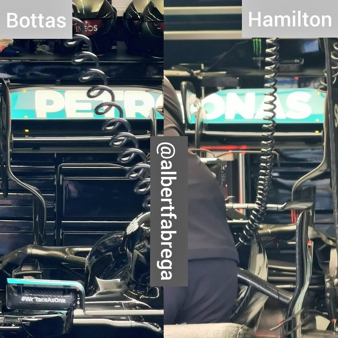 Rechts vind je twee foto's van de Mercedes W12. Onder is de afstelling die door de heren gebruikt is tijdens VT1. Mercedes hanteert een andere aanpak dan de Oostenrijkse rivalen. Waar Red Bull de vleugeldikte aanpast, zie je bij Mercedes dat ze eigenlijk vooral de hellingshoek van de achtervleugel aanpassen. Ze leggen de vleugel platter, waardoor deze automatisch minder neerwaartse druk genereert. Dit is makkelijker aan te passen en bovendien is de noodzaak er niet om een alternatieve achtervleugel te ontwikkelen.