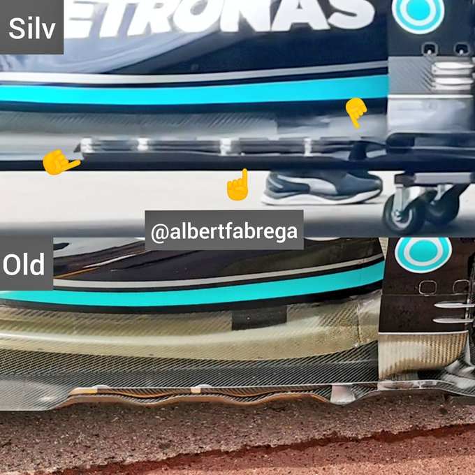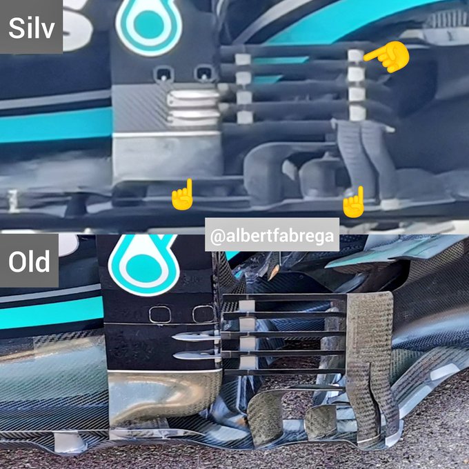 Al voordat de Mercedes-bolides in actie komen op Circuit Silverstone spotte Albert Fabrega al een aantal aanpassingen aan de W12 van de Duitse renstal. De vloer, een van de belangrijkste aerodynamische onderdelen van hedendaagse Formule 1-wagens, kent een verandering aan de zijkant. Het golvende uiterlijk is veranderd naar een strakker design. Ook zijn er verschillende openingen toegevoegd aan de zijkant van de vloer.