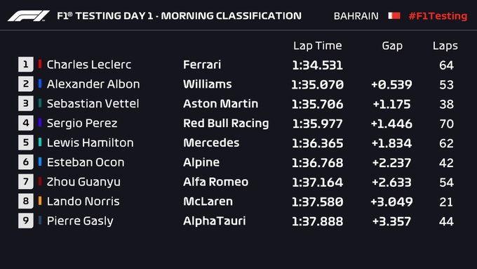Charles Leclerc heeft de ochtendsessie van de eerste testdag in Bahrein als snelste afgesloten. De Ferrari-coureur klokte met een 1:34,531 de snelste tijd, terwijl Sergio Pérez de man was met de meeste ronden. Alexander Albon en Sebastian Vettel sluiten de ochtendsessie qua tijden af als respectievelijk tweede en derde. De dag werd afgetrapt door
