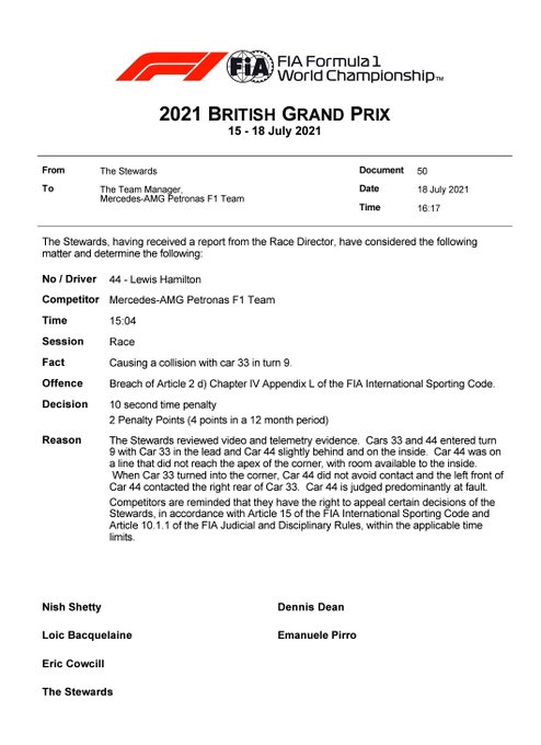 'Nummer 44 zit voornamelijk fout', is het oordeel van het veiligheidsorgaan in de Formule 1. Ondanks de tijdstraf kon Hamilton alsnog de Grand Prix van Groot-Brittannië op zijn naam schrijven. Teambaas