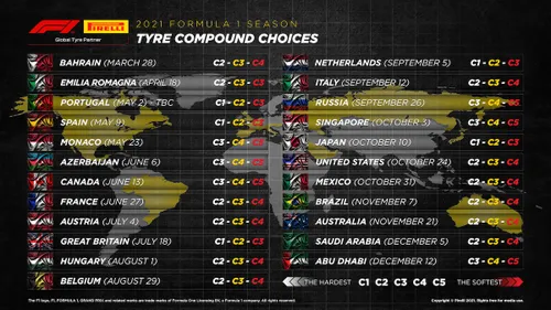 Pirelli heeft alle bandencompounds die dit jaar gebruikt zullen worden voor het gemak alvast aangekondigd in aanloop naar het nieuwe seizoen. (Foto: Pirelli Motorsport)