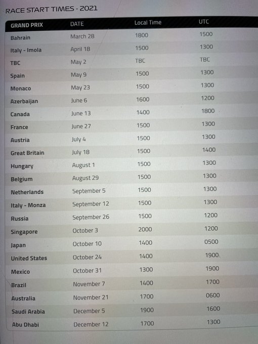 officiële website de starttijden voor 2021 naar buiten gebracht. In tegenstelling tot vorig jaar, toen de Grands Prix altijd tien minuten na het volle uur begonnen, zullen de races aankomend seizoen weer op het uur beginnen. Ook zitten er voorlopig twee races tussen waarvoor je vroeg je bed uit moet, Japan en Australië.