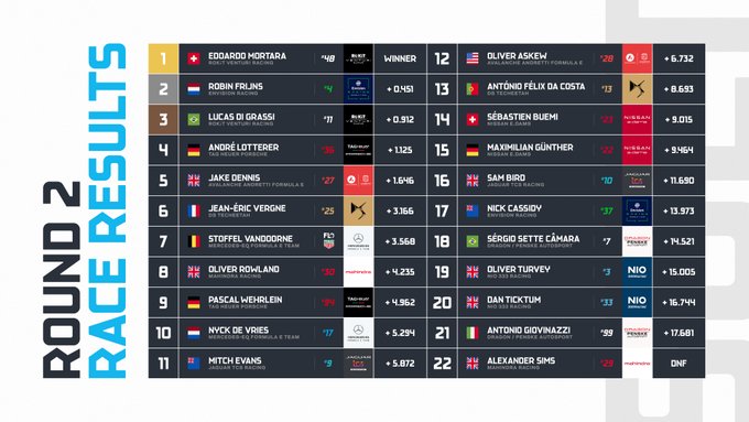 De tweede ePrix van Saoedi-Arabië is er voor Nyck de Vries eentje om snel te vergeten. De Nederlander begon vanaf poleposition en wist die eerste plek te behouden na de start. Eenmaal verder in de race moest De Vries zijn plek afstaan aan Lucas di Grassi. Daarna was het Edoardo Mortara, die de race uiteindelijk won, degene die voorbijging aan de Mercedes-coureur. Toen Jean-Éric Vergne voorbij wilde gaan aan De Vries, ging het mis. Ze raakten elkaar en daardoor viel De Vries terug naar de tiende plek.