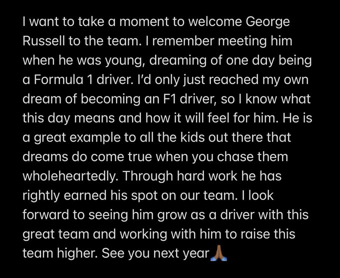 'Ik heb met mijn eigen ogen gezien hoe George door hard werken zich omhoog heeft geknokt. Ik kan niet wachten om hem te zien groeien bij ons in het team en ik zou graag met hem willen werken om het team nog beter te maken', sluit Hamilton af.