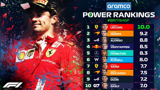 De grote winnaar in de Formula 1 Power Rankings van deze week is Charles Leclerc. De Monegask kreeg van de zeskoppige jury een perfecte tien toebedeeld. Daarnaast maakte ook Lando Norris indruk en kreeg hiervoor wederom een goed cijfer. 'Leclerc lijkt altijd te genieten van de uitdagingen op