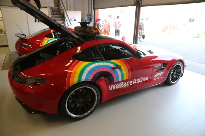 Auto Motor Und Sport. 'Er waren ook geen bezwaren van de FIA of de rechthebbenden.' Behalve de gewijzigde kleuren is de safety car verder identiek aan die van vorige week. De 585 pk sterke AMG GT R draagt de Formule 1- en FIA-sticker op de motorkap. Ook is de auto weer uitgerust met een regenboog, het symbool voor de 'We Race As One'-campagne.