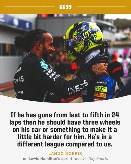 Lando Norris heeft verbijsterd gereageerd op de prestatie van Lewis Hamilton gedurende de sprintrace in Brazilië. De zevenvoudig wereldkampioen wist zich snel een weg te banen richting de voorkant van de grid en verschalkte de ene na de andere concurrent. Zijn landgenoot grapt dat er misschien maar andere regels voor hem moeten gaan gelden. 'Als hij van laatste naar vijfde gereden is in 24 ronden moeten we hem maar eens laten rijden met drie wielen of iets dergelijks, om het wat moeilijker voor hem te maken', liet de