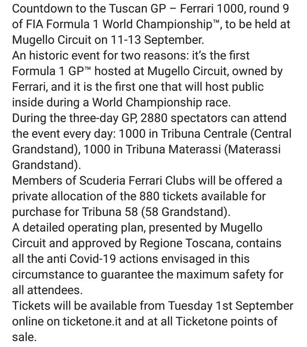 Een klein feestje voor Ferrari en de Italiaanse Formule 1-fans. Op het circuit van Mugello zijn voor de Grand Prix van Toscane in september een kleine 3000 fans toegestaan. Het plan van het circuit om alles veilig en corona-proof te laten verlopen is goedgekeurd door de lokale autoriteiten, waardoor de eerste Formule 1-race van 2020 mét fans een feit is. Het circuit laat via Twitter weten dat het officieel toestemming heeft gekregen om 2880 fans per dag toe te laten op het circuit. 2000 fans kunnen zich inschrijven via een Italiaanse ticketwebsite, terwijl er 880 tickets naar een speciale Ferrari supportersclub zal gaan.