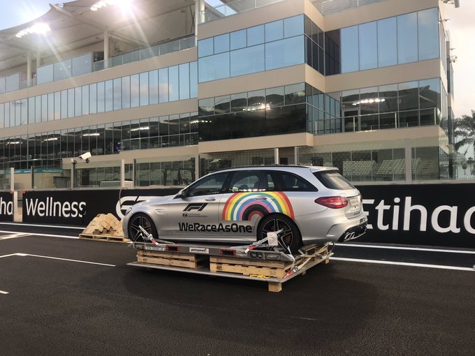 Ondanks dat het nog niet bekend is of Lewis Hamilton deel kan nemen aan de Grand Prix van Abu Dhabi, hangt zijn naam en foto wél boven de garage van Mercedes in de pitstraat van het Yas Marina Circuit. De naam en foto van George Russell hangt daarom ook gewoon boven de garage van Williams.