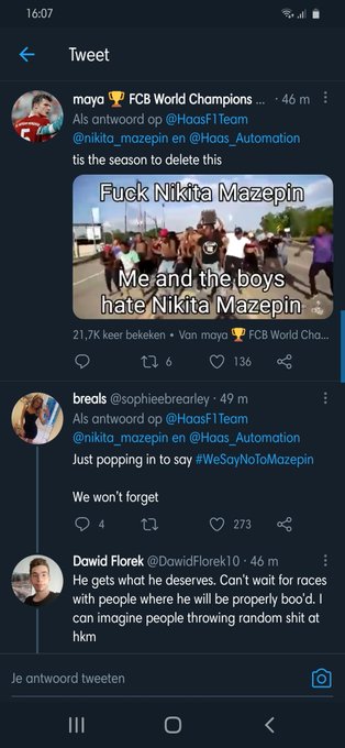 deze tweet waarin de Rus zijn stoeltje past. Zoals al vaker in het verleden is gebeurd, heeft deze tweet ook weer de nodige reacties opgeleverd van mensen die tegen Mazepin zijn. Ze zijn tegen hem door beelden die vorig jaar waren opgedoken, waarin hij aan een vrouw zou hebben gezeten tegen haar zin in.