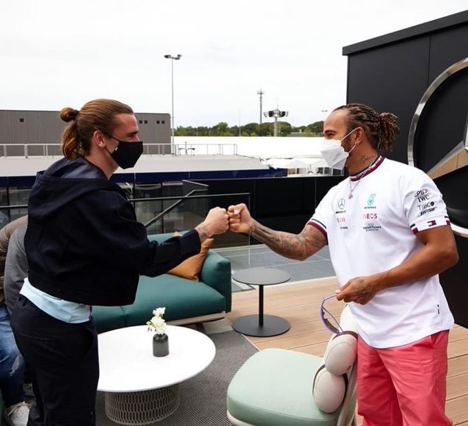 Hamilton ontmoet Antoine Griezmann in paddock