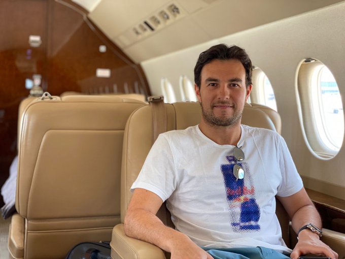 Sergio Pérez, die via Twitter laat zien hoe hij per privéjet onderweg is naar de locatie van alweer de zesde race op de kalender van 2021.