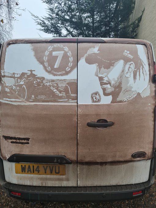 Modder-artiest Ruddy Muddy nam de tijd om zevenvoudig Wereldkampioen Lewis Hamilton te eren door een kunstwerk te maken op de achterkant van een wit bestelbusje. Zo ziet het indrukwekkende kunstwerk er uit.