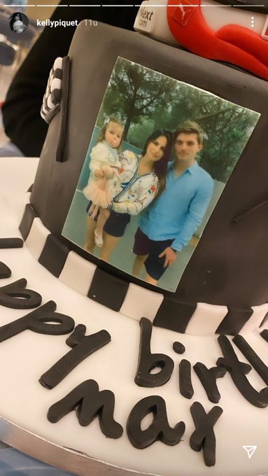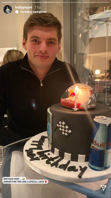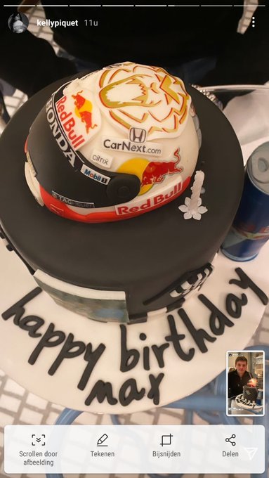 Als je als Red Bull Racing-coureur jarig bent dan mag een taart in Red Bull-thema uiteraard niet ontbreken. Ook Kelly Piquet wist dit. Ze liet een taart maken met een Red Bull-helmpje erop en een foto van haar, Verstappen en haar dochtertje om de 24ste verjaardag van de Nederlander te vieren.