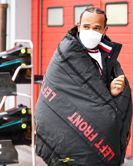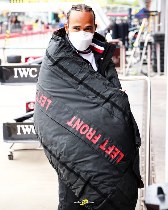 Lewis Hamilton arriveerde eerder in Imola al in stijl met een schaakbordpak, maar nu heeft hij weer een modieus hoogstandje bereikt. Zo houdt de zevenvoudig wereldkampioen zich niet warm met een jas, maar met één van de bandenwarmers van de banden van zijn Mercedes W12.