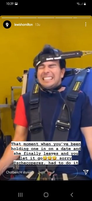 Lewis Hamilton deelde gisteravond een hilarisch berichtje via zijn Instagram-story. Zo steekt hij de draak met een 'schetende' Sergio Pérez. Zo laat de Mexicaan natuurlijk niet echt een scheet, maar zet hij gewoon kracht zijn hoofd tijdens een trainingssessie. Desondanks vond de Engelsman zijn gezichtsuitdrukking verdacht veel lijken op een moment dat je eindelijk jezelf kan laten gaan.