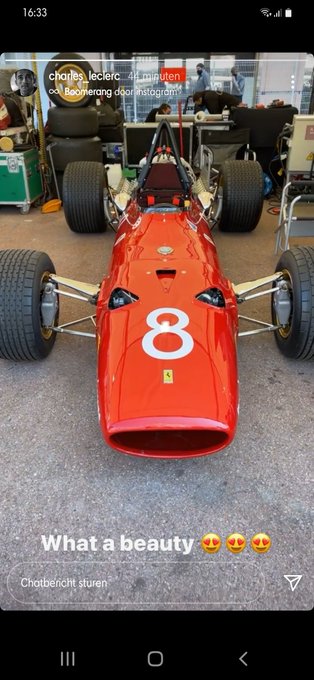 Charles Leclerc is helemaal weg van de oude Ferrari Formule 1-auto op de onderstaande foto. Zo deelde de Monegask op zijn Instagram-story een clipje waarin hij voor de wagen staat. Wat hij bij deze doet en wat hij ermee zal doen, is niet bekend.