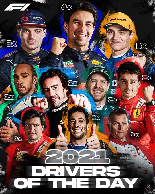Sergio Pérez heeft dit seizoen de meeste 'Driver of the Day'-titels op zijn naam geschreven. De Red Bull Racing-coureur werd vier keer verkozen tot de beste rijder van de dag. Teamgenoot Max Verstappen en McLaren-coureur Lando Norris werden beiden drie keer uitgeroepen tot 'Driver of the Day'. Tien coureurs in het veld hebben de titel geen één keer mogen dragen afgelopen seizoen.