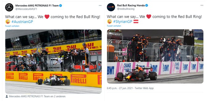 Mercedes erbij te halen. Het Twitter-bericht van de Oostenrijkse renstal lijkt wel verdacht veel op deze Mercedes-tweet van 2020..