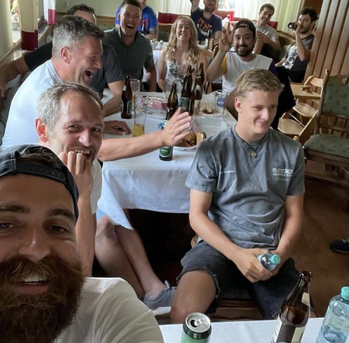 Mick Schumacher keek de wedstrijd met enkele Britse, begrijpelijk blije medewerkers van Haas. De coureur zelf zat er wat minder tevreden bij, gezien de uitschakeling van