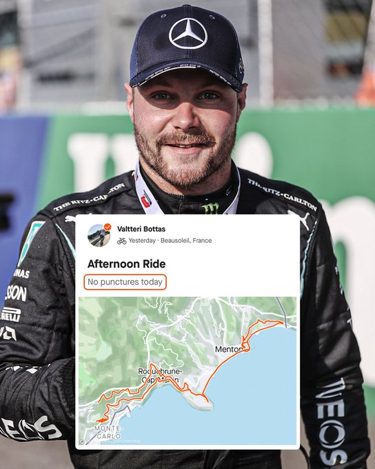 Valtteri Bottas raakte in Qatar een puntenfinish kwijt, maar zijn gevoel voor humor niet. Via de Strava-app houdt hij geregeld zijn fietsritjes bij buiten de F1-weekenden om. Toen hij heelhuids zijn meest recente rit in Frankrijk doorkwam, besloot hij een social mediapost te maken met zelfspot.
