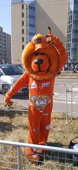 De man in het oranje leeuwenpak is dit weekend wel vaker gesignaleerd in en nabij Zandvoort. De oranjeleeuw begint nu ook internationaal op te vallen. Zo heeft de Britse journalist Ben Hunt een foto van hem gedeeld op social media.