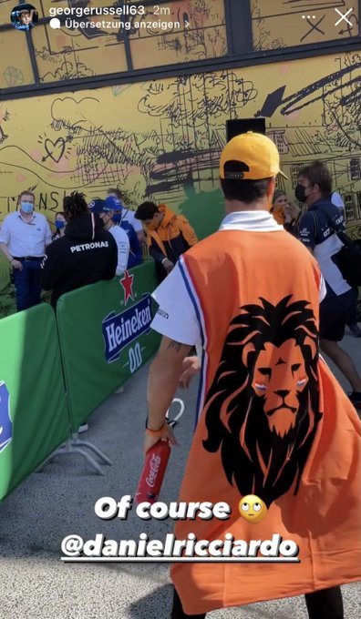 Instagram Story van George Russell is namelijk te zien hoe de Australiër zich een echte Nederlander waant. Hij heeft ergens een oranje cape gevonden en draagt die in de paddock.